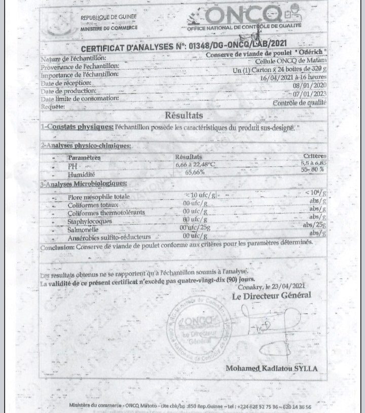 Le premier examen a été effectué au laboratoire de l’Office National de contrôle de qualité. L’échantillon en provenance de l’ONCQ de Matam a été reçu le 16 Avril 2021. Le rapport a été finalisé le 23 Avril 2021. La conclusion dit ceci : Conserve de viande de poulet conforme aux critères pour les paramètres déterminés. Voir ci-dessous le Certificat d’analyse.