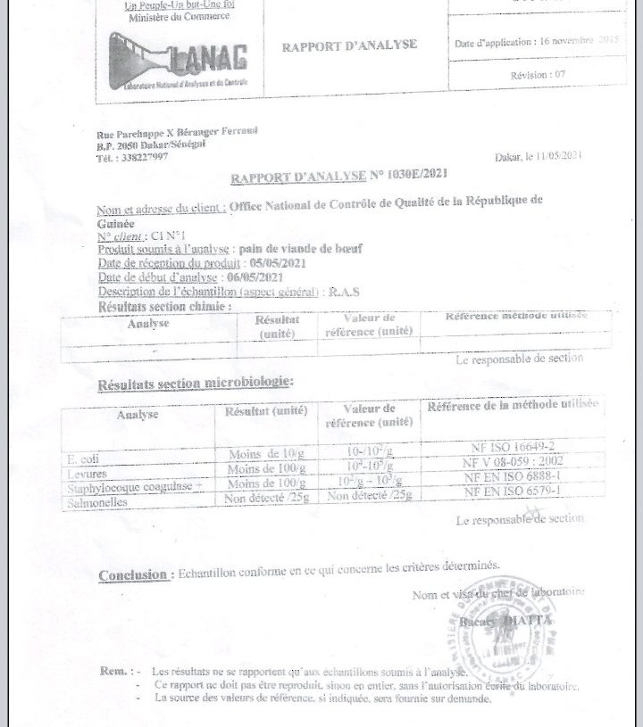 Des échantillons ont également été envoyés au Laboratoire National d’analyse et de contrôle de Dakar, au Sénégal pour des examens, c’était le 05 Mai 2021. L’analyse a débuté le lendemain 06 Mai et ce n’est que le 11 Mai 2021 que le rapport d’analyse a été bouclé. Dans sa conclusion, le rapport révèle que l’échantillon analysé est conforme aux critères déterminés, c’est-à-dire que cet échantillon ne contient pas d’éléments nocifs à la santé, le résultat est donc négatif. Voir rapport d’analyse ci-dessous.