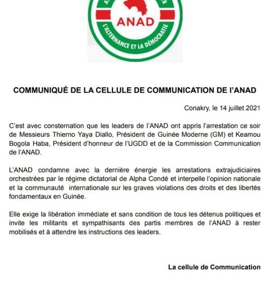 Conakry-C’est une réaction de l’Alliance nationale pour l’alternance et la démocratie suite aux nouvelles arrestations dans ses rangs. La déclaration rendue publique par cette alliance dans la soirée du 14 juillet, sonne aussi comme une menace à peine voilée de cette opposition qui appelle ses militants à la mobilisation. Lire le communiqué ci-dessous !