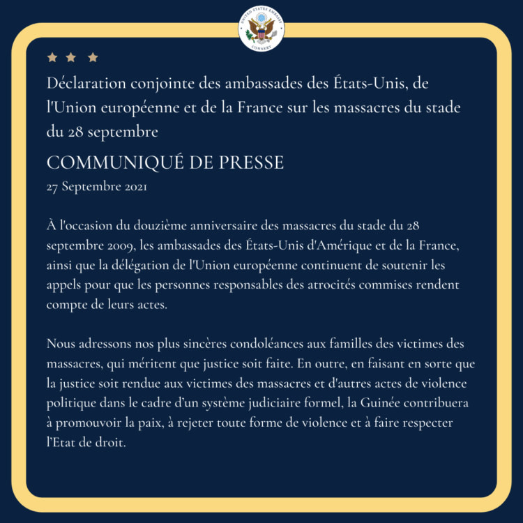12e anniversaire du massacre du 28 septembre: déclaration des ambassadeurs occidentaux en Guinée