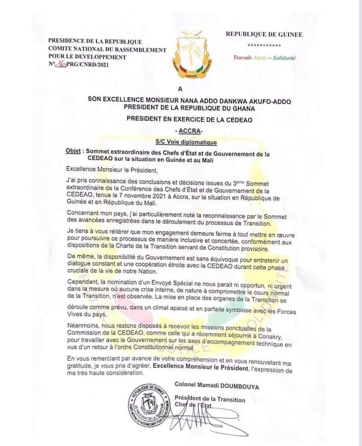 Guinée: la junte récuse la nomination par la CEDEAO d’un envoyé spécial (Copie lettre)