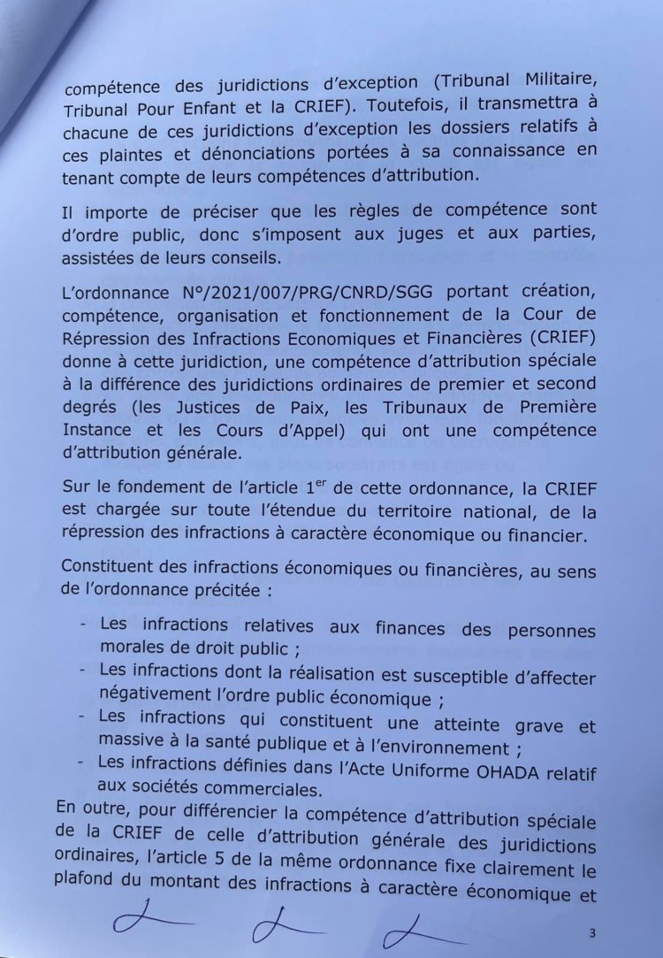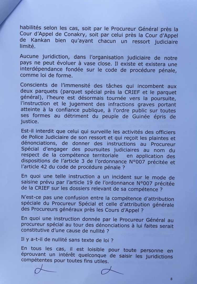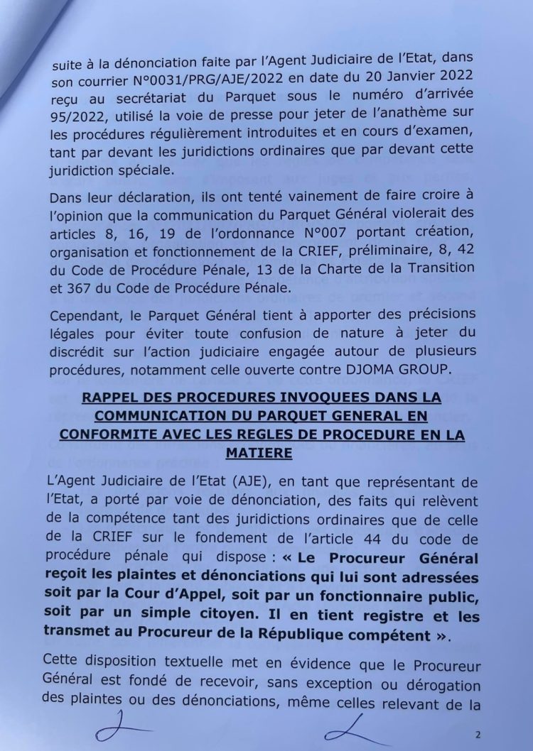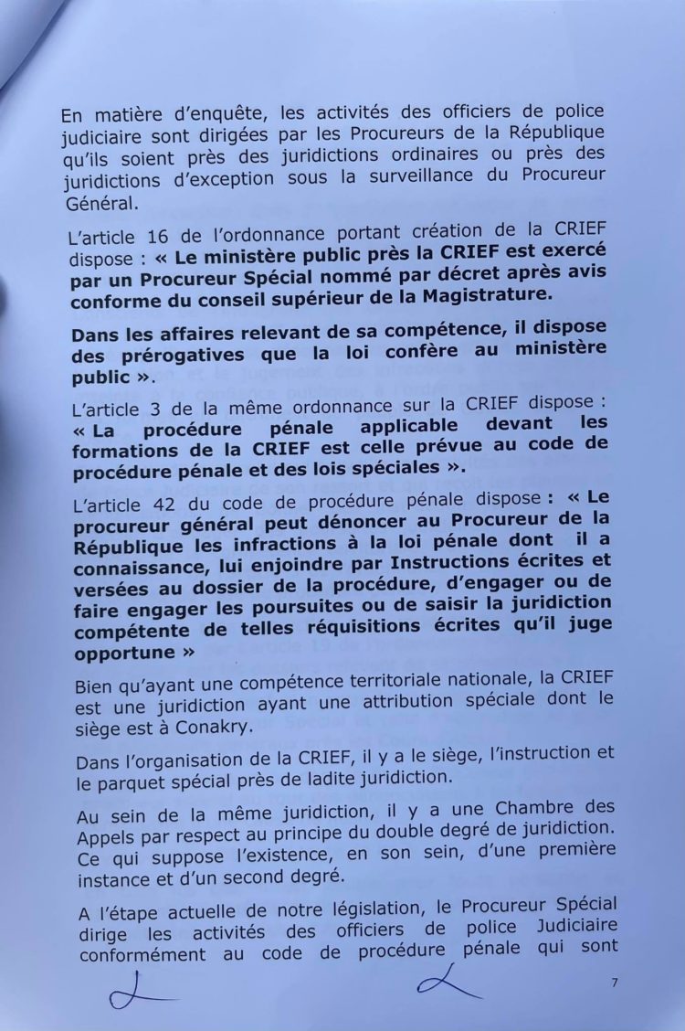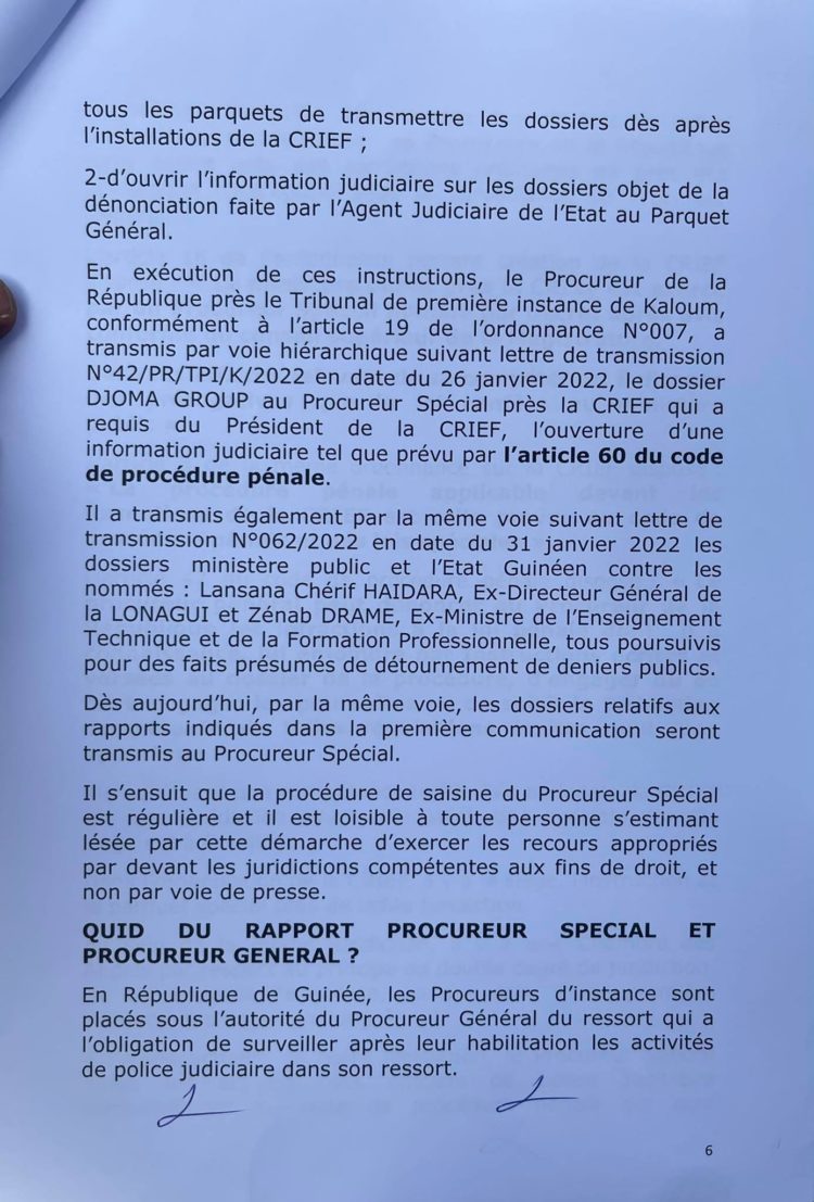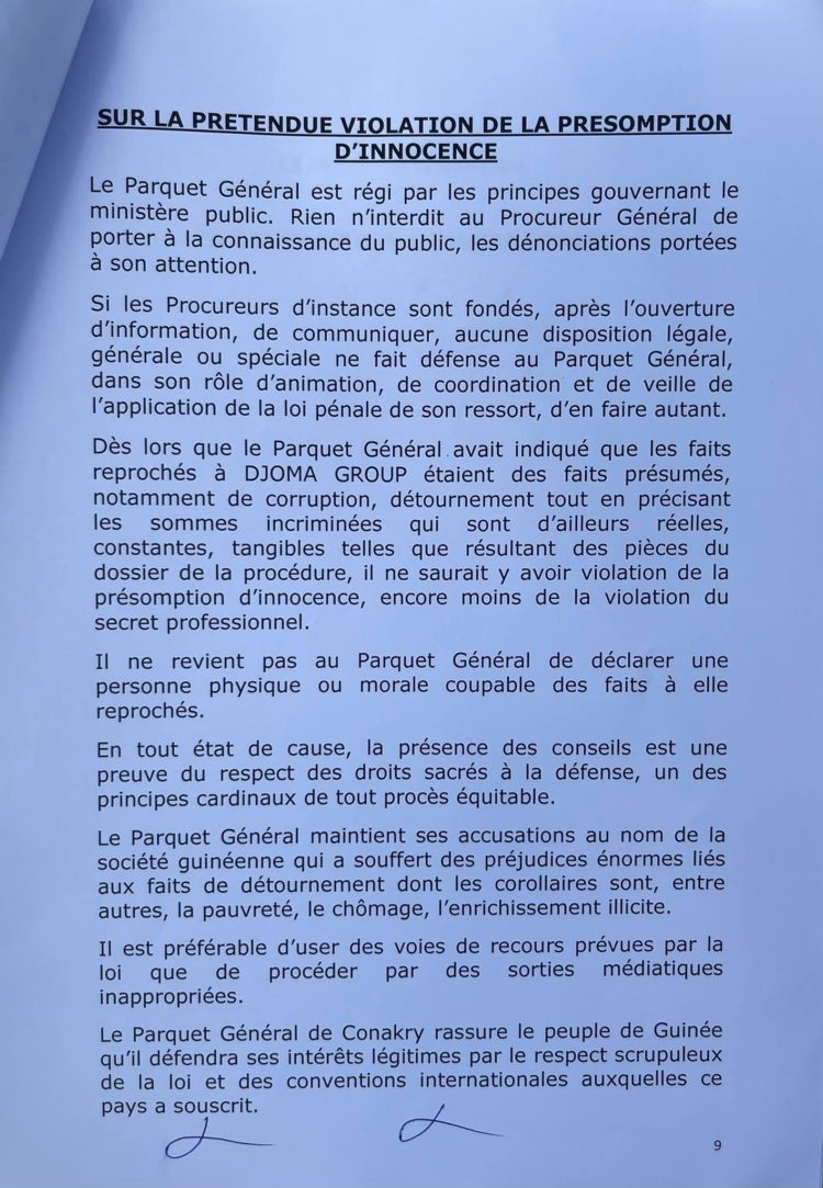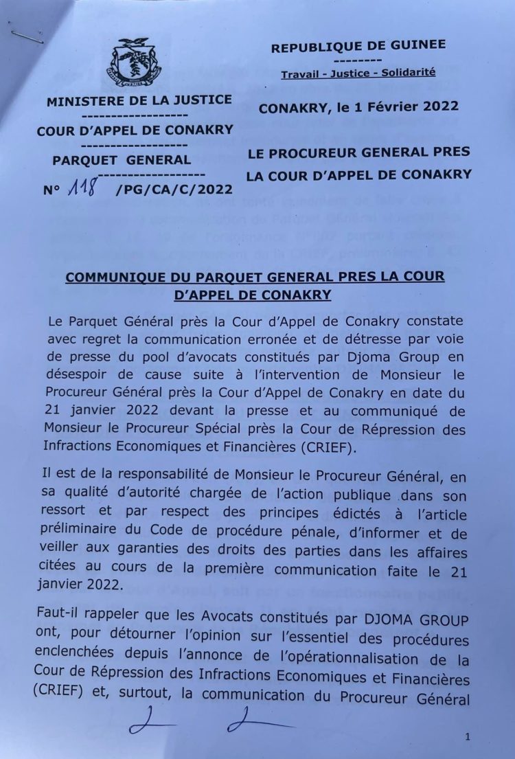 Après la communication officielle du procureur général près la cour d’appel de Conakry, Alphonse Charles Wright, sur de nombreuses affaires dont celle concernant le groupe Djoma de l’ancien proche d’Alpha Condé, Kabinè Sylla alias Bill Gates, suivie de la saisine du procureur spécial de la Cour de répression des infractions économiques (CRIEF) de la même affaire, une instruction a été ouverte avec à la clef plusieurs chefs d’accusations qui donne de l’insomnie. Dans une sortie lundi, les avocats du groupe Dioma de l’ancien intendant de la Présidence de la République, ont dénoncé ce qu’ils qualifient de vices de procédure en s’attaquant principalement à la communication médiatique du procureur général. Ce dernier, selon eux, a violé un principe de secret en étalant sur la place publique les numéros des comptes en banque des entreprises du groupe Dioma. Alphonse Charles Wright n’a pas attendu longtemps pour revenir à la charge. Ce mardi matin, le procureur général a rencontré la presse et rendu public un communiqué de dix pages (à lire ci-dessous) pour battre en brèche les arguments des avocats dont il qualifie les propos de « communication d’erronée et de détresse ». Non seulement il explique toute la procédure concernant cette affaire et essaie de relever qu’aucun vice n’a existé, mais il mentionné rappelle également les chefs d’accusation qu’il dit maintenir.