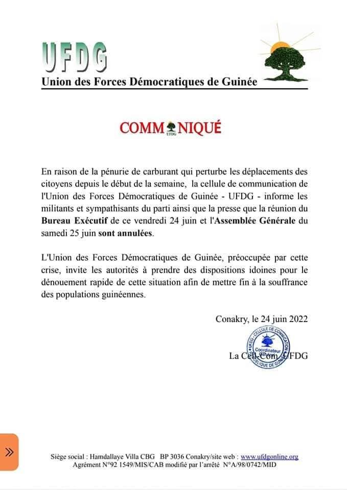 Pénurie de carburant: l’UFDG annule deux importantes réunions (communiqué)