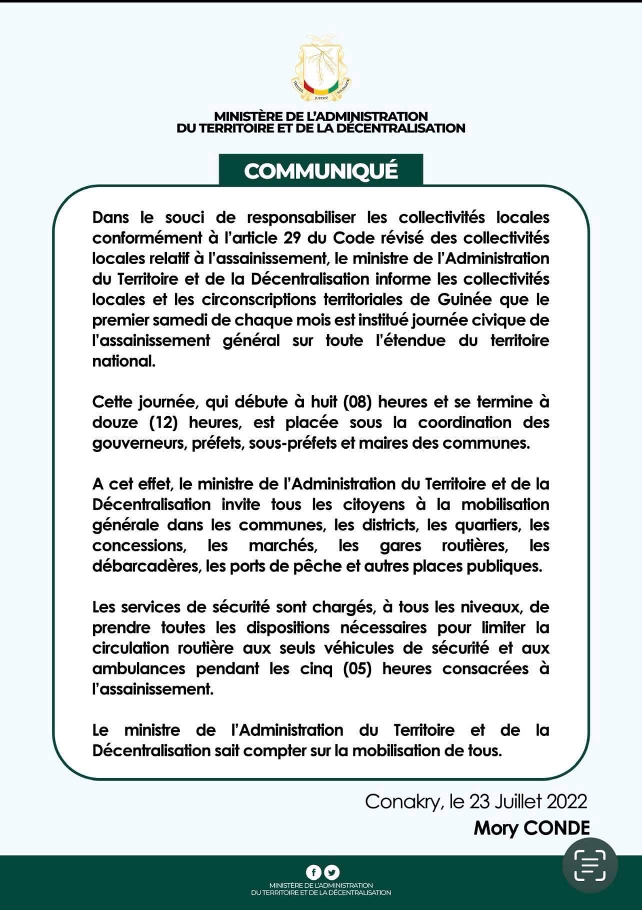 MATD: Mory Condé institue une « journée civique de l’assainissement général » (communiqué)