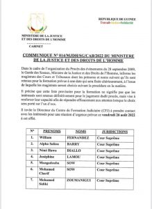 Dans le cadre des préparatifs de la tenue du procès des événements du 28 septembre 2009, le Ministère de la Justice et des droits de l’homme a dressé une liste de 61 magistrats retenus pour une formation.