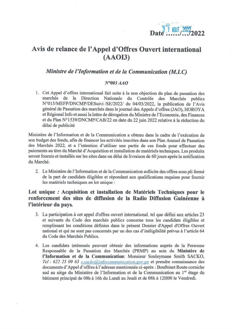 Avis de relance de l’appel d’offres ouvert international (AAO13) du ministère de l’Information et de la Communication