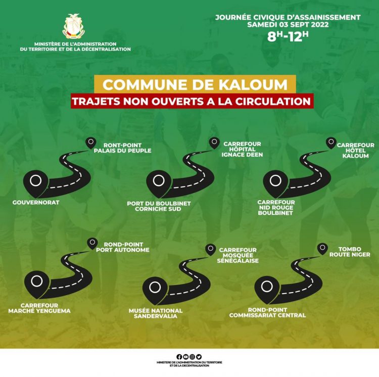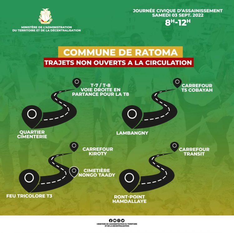 Le Ministre de l’Administration du Territoire et de la Decentralisation informe que la circulation ne sera pas bloquée, cependant les axes routiers ci-dessous ne seront pas ouverts pour cause de grands travaux :