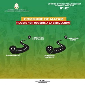 Par la même occasion, il rappelle que conformément à la directive gouvernementale, la deuxième journée de mobilisation citoyenne pour l’assainissement aura lieu le samedi 03 septembre 2022 sur toute l’étendue du territoire nationale de 8h à 12h.