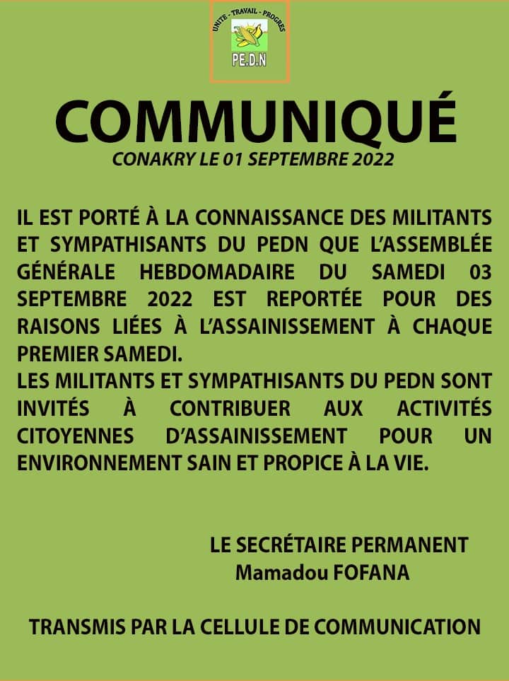 Dans sa politique de contribuer à l’assainissement de la capitale Conakry initié par les autorités, le parti de l’espoir pour le développement national (PEDN) a, dans un communiqué transmis à notre rédaction dans la soirée du vendredi 02 septembre 2022, informé ses militants et sympathisants du report de son Assemblée Générale hebdomadaire de ce samedi 03 septembre.