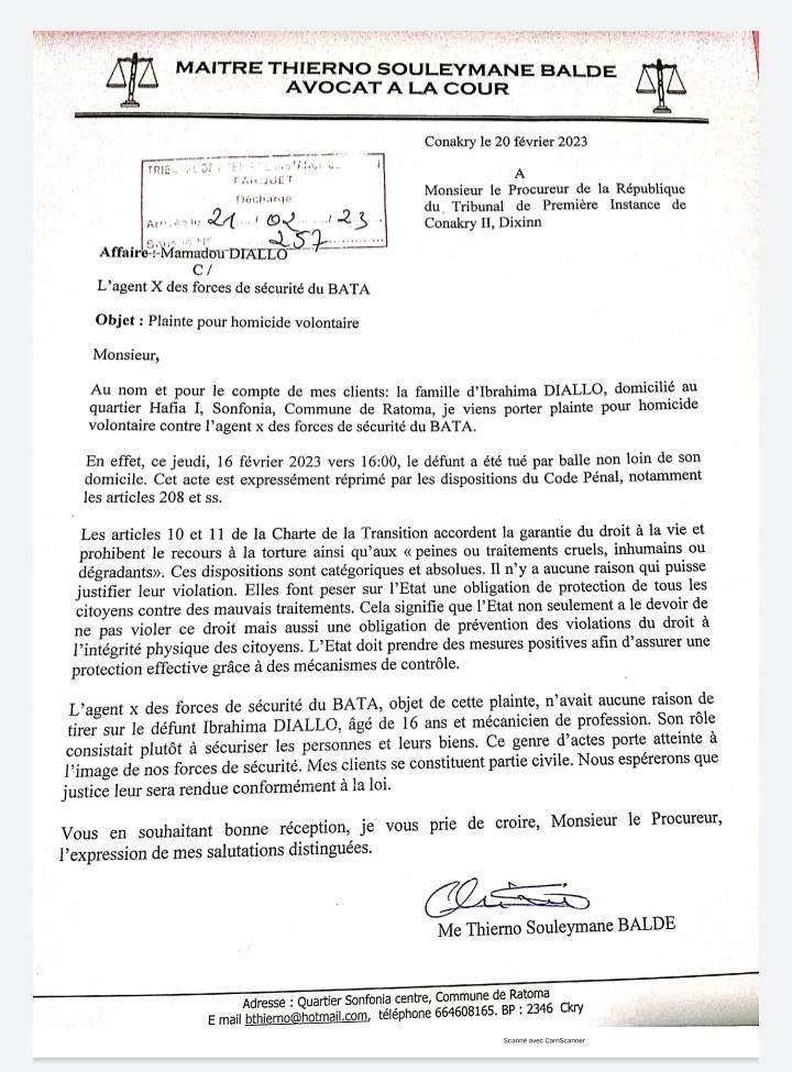 C’est une information Guinee114.com. La famille d’Ibrahima Diallo, mécanicien âgé de 16 ans, tué lors de la manifestation du jeudi 16 février à Sonfonia dans la commune de Ratoma (Conakry) a saisi le tribunal de première instance de Dixinn d’une plainte pour homicide involontaire contre l’agent X du BATA (bataillon autonome des troupes aéroportées).