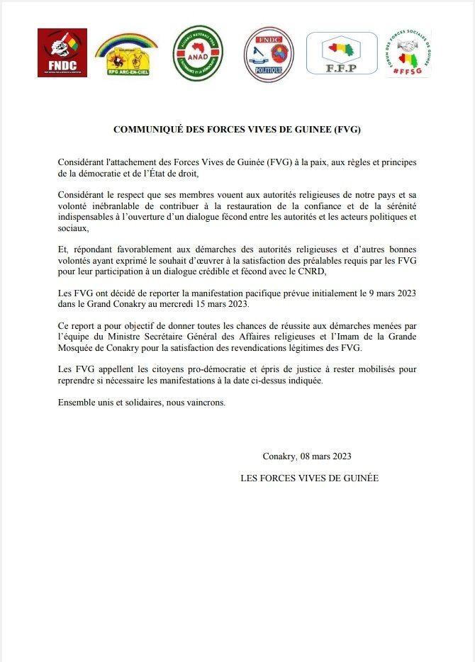 Les FVG (Forces Vives de Guinée) ont décidé de reporter la manifestation pacifique prévue initialement le 9 mars 2023 dans le Grand Conakry au mercredi 15 mars 2023.