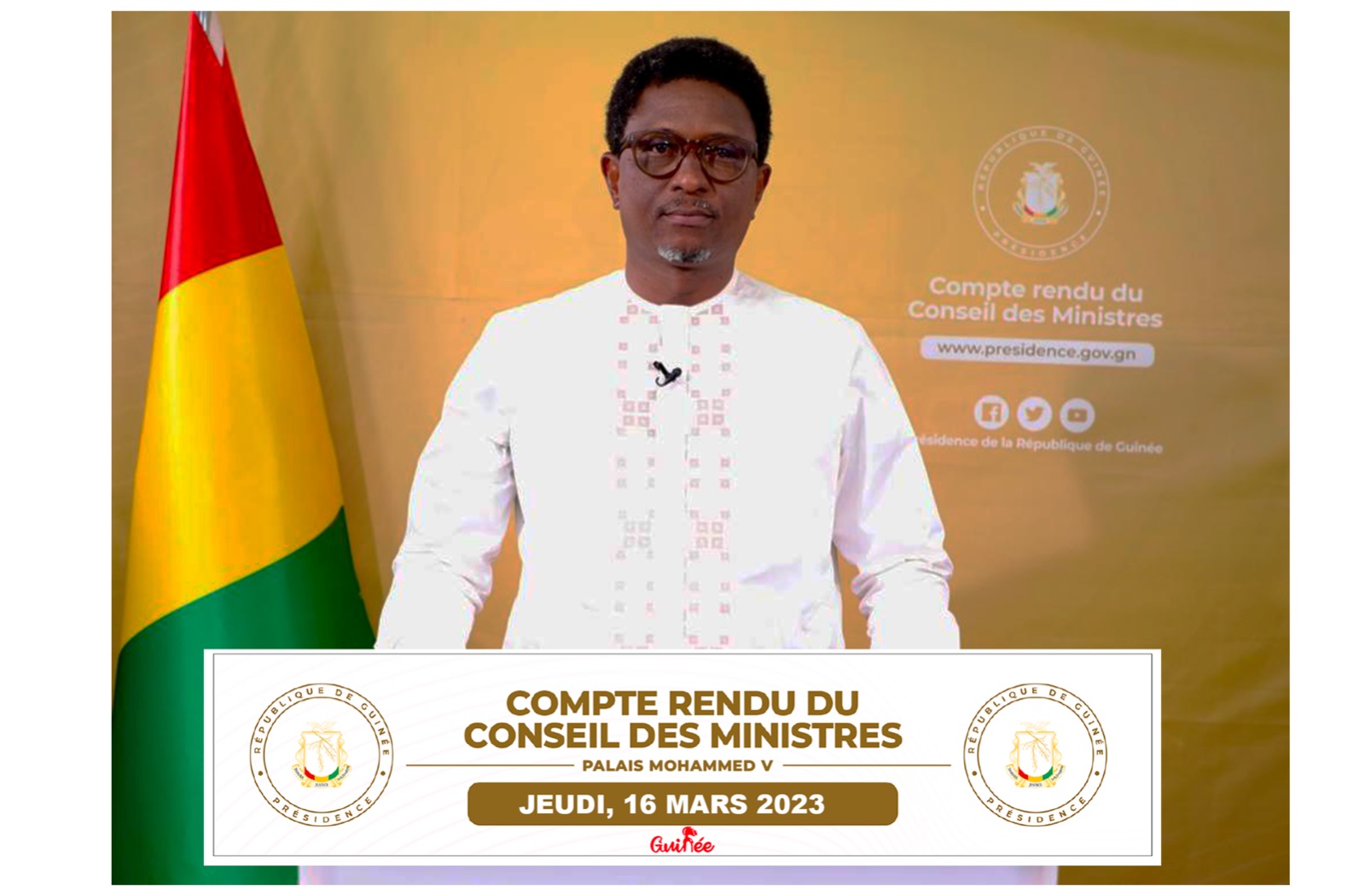 La Session Ordinaire du Conseil des Ministres s’est tenue ce jeudi 16 mars 2023 de 10H à 12H, sous la Haute Autorité de son Excellence Monsieur le Président du CNRD, Président de la Transition, Chef de l’Etat, Chef Suprême des Armées, le Colonel Mamadi DOUMBOUYA.
