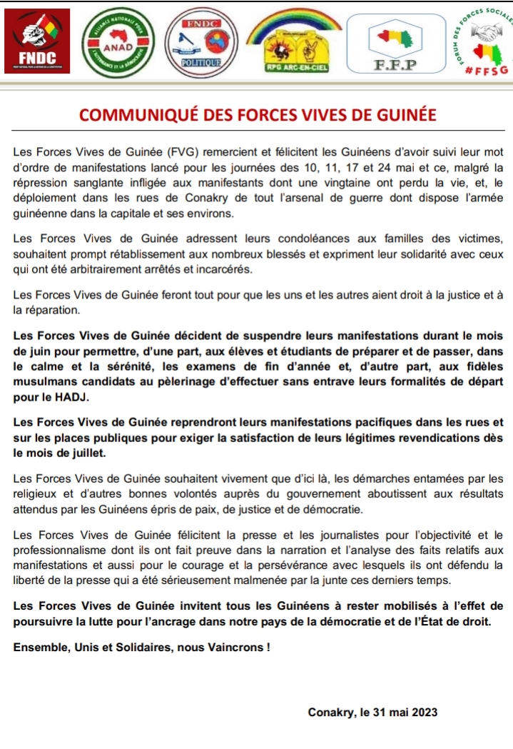 Forces vives: suspension des manifestations « à cause des examens et du départ des pèlerins » (Communiqué)