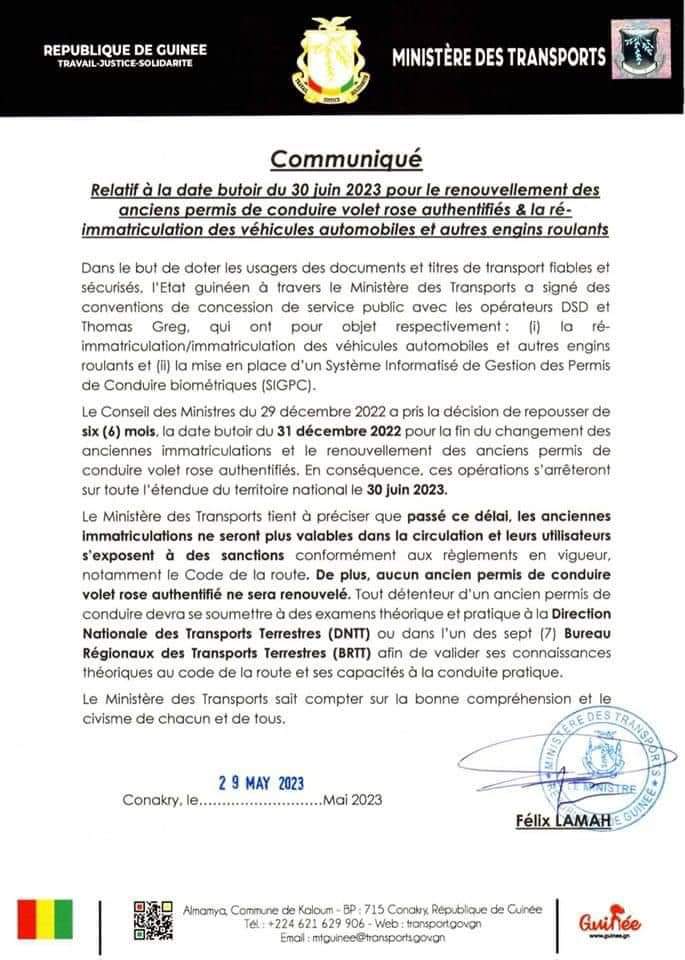 « Le Ministère des Transports tient à préciser que passé ce délai, les anciennes immatriculations ne sont plus valables dans la circulation et leurs utilisateurs s’exposent à des sanctions conformément aux règlements en vigueur, notamment le Code de la route. De plus, aucun ancien permis de conduire volet rose authentifié ne sera renouvelé »