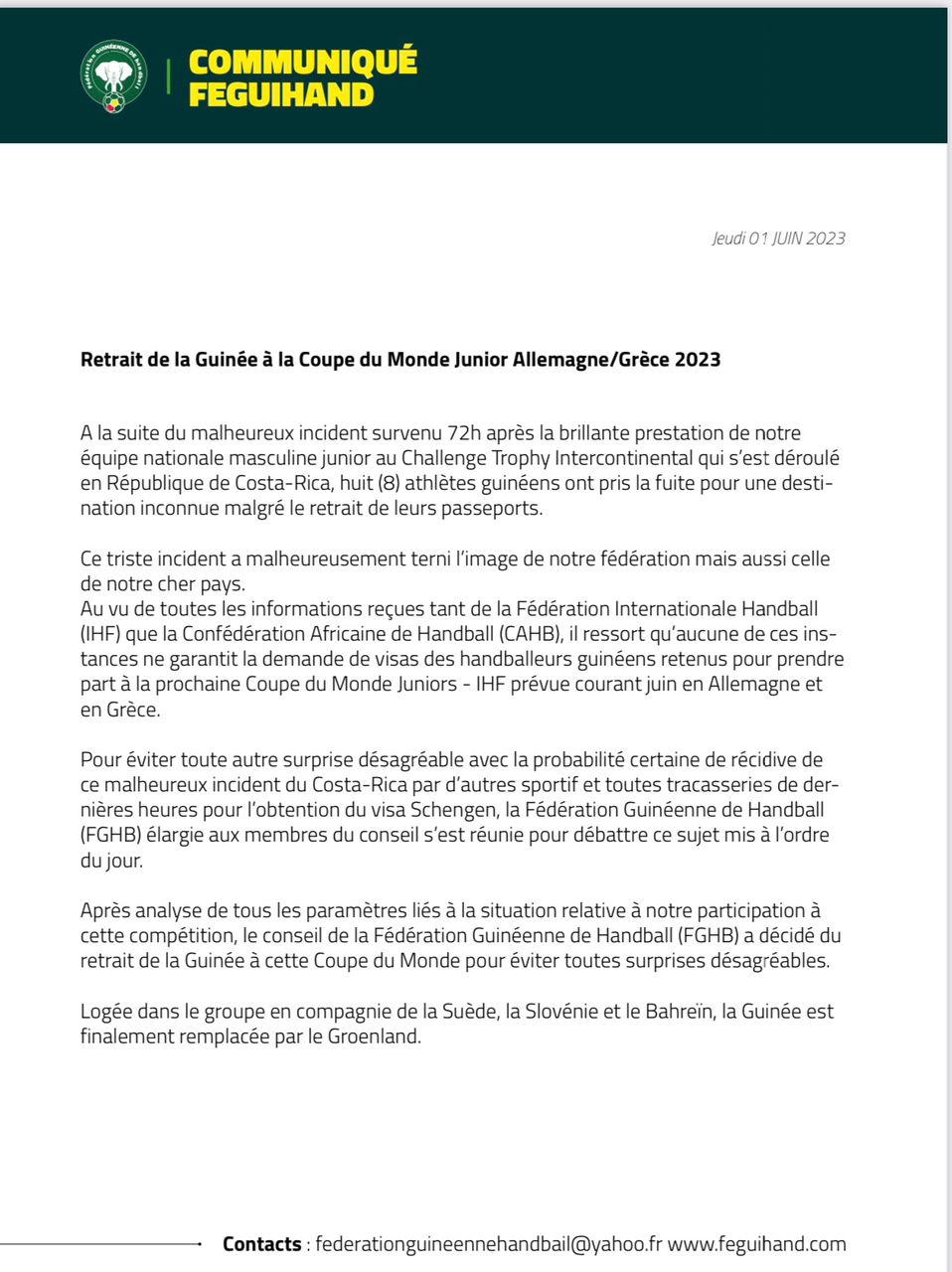 Malgré sa qualification, la Guinée se retire de la Coupe du monde de handball junior (Communiqué)