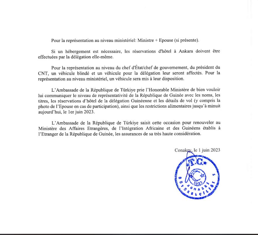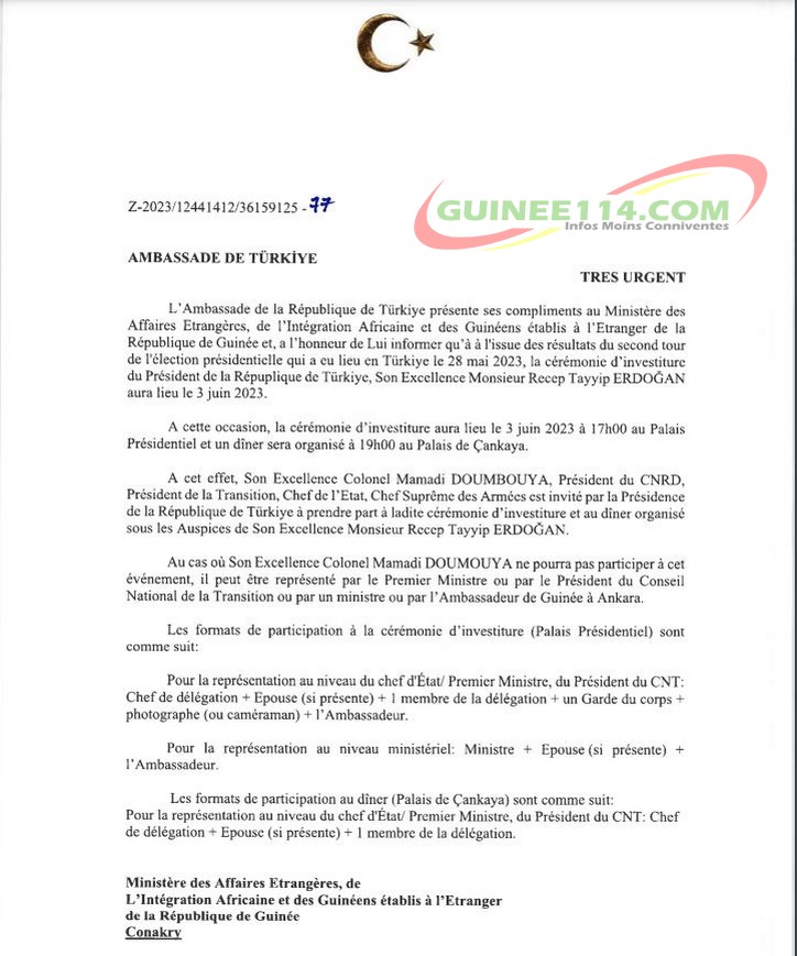 C’est un document qui clôt le débat. Depuis l’annonce du départ du Colonel Mamadi Doumbouya, président de la transition pour assister à l’investiture de son homologue turc, ce voyage présidentiel occupe la Une des médias. Alors que beaucoup s’interrogent sur les retombées diplomatiques, politiques et économiques de ce déplacement placé sous le signe du raffermissement des relations entre la Guinée et la Türkiye, certains internautes y voient un séjour forcé. Ceux-ci sont allés jusqu’à insinuer que le président Mamadi Doumbouya est parti en Türkiye sans être invité par les autorités de ce pays d’accueil d’Alpha Condé. Le courrier ci-dessous, auquel Guinee114.Com a pu accéder, clôt ainsi ce pan du débat que soulève le séjour turc du président du CNRD.