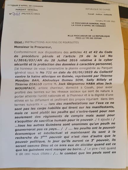 La sortie ratée de l’artiste Jack Woumpack, qui s’en est pris violemment à la communauté peule de Guinée, ne reste pas sans conséquence. Le procureur général près la Cour d’appel de Conakry a instruit le procureur de la République près le tribunal de première instance de Coyah d’engager des poursuites judiciaires contre le chanteur. Yamoussa Conté demande au parquet de Coyah de saisir sans délai la Brigade de recherche pour des fins d’enquête et de procès-verbal.