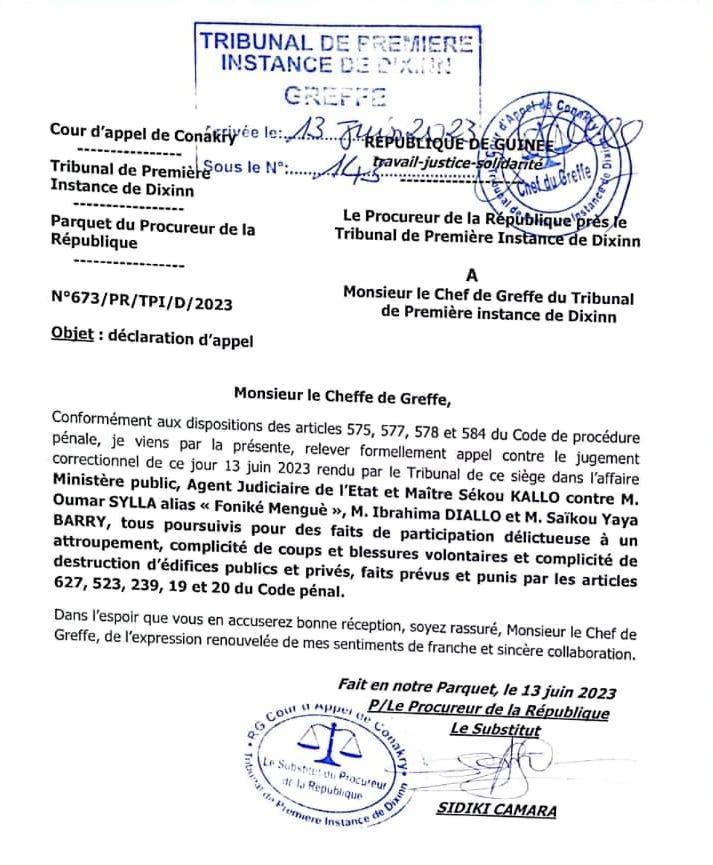 Le procès de Oumar Sylla dit Foniké Menguè, Ibrahima Diallo et Saïkou Yaya Barry n’a peut-être pas encore trouvé son épilogue. Alors que leurs partisans n’ont même fini de célébrer leur libération par la justice, le ministère public a relevé appel contre la décision rendue par le juge Kabinet Keïta. N’étant pas satisfait de ce jugement, le parquet du tribunal de première instance de Dixinn sollicite donc l’ouverture d’un nouveau procès devant la Cour d’appel de Conakry.