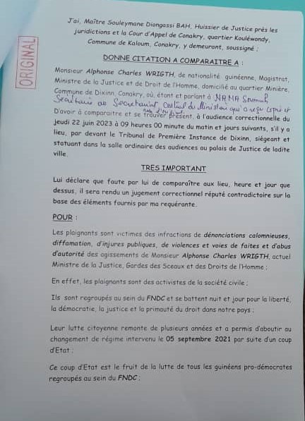 Le Garde des sceaux est cité à comparaître jeudi prochain, 22 juin 2023, devant le tribunal de première instance de Dixinn. Il est poursuivi pour des faits de dénonciations calomnieuses, diffamation, injures publiques, violences et voies de faits et abus d’autorité.