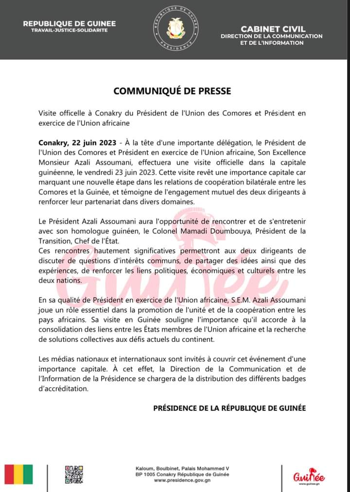 Une délégation de l'Union africaine conduite par le président Comorien annoncée à Conakry (Communiqué)