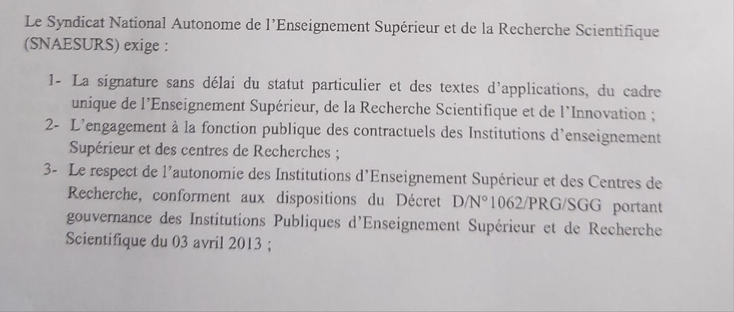 Ci-dessous les points de revendications contenus dans le préavis de grève du SNAESURS, publié le 06 juillet dernier :