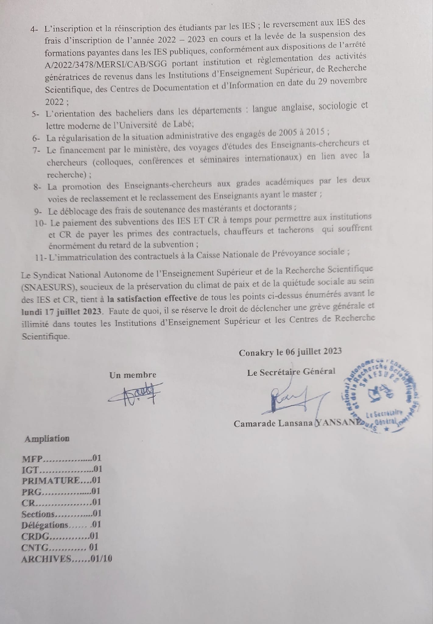 « Le Syndicat National Autonome de l’Enseignement Supérieur et de la Recherche Scientifique (SNAESURS) lance un avis de grève générale et illimitée dans toutes les Institutions d’Enseignement Supérieur, les Centres de Recherche, de Documentation et d’Information à compter de ce mardi 18 juillet 2023.