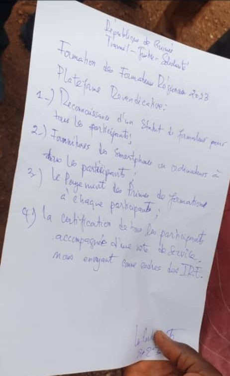 Ces enseignants demandent : la reconnaissance du statut de formateur pour chaque enseignant concerné ; la dotation de smartphones ou d’ordinateurs pour chacun ; la certification de tous les participants et la production d’une note de service les mettant à la disposition des inspections régionales de l’éducation (IRE) ; le versement des primes de formation pour tous les participants.