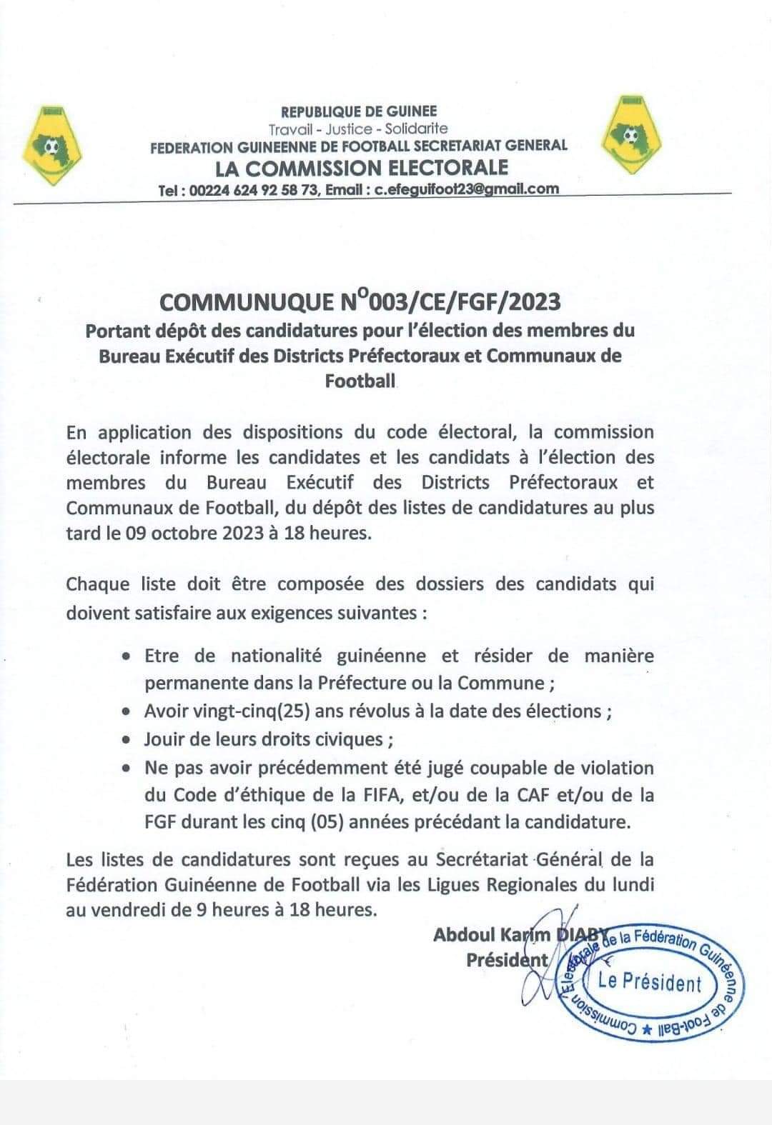 Il faut déposer leurs dossiers de candidatures au plus tard le 09 octobre 2023 et satisfaire à certaines exigences. La commission électorale de la Fédération guinéenne de football a annoncé ces exigences dans un communiqué publié ce jeudi.