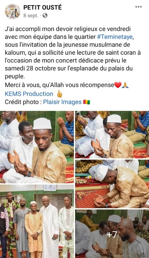 Dans un post Facebook en date du 8 septembre dernier, l’artiste Petit Ousté, auteur du titre Böbö, a déclaré avoir prié dans une mosquée de Kaloum, où des jeunes l’auraient invité pour la lecture du saint Coran, en présence des imams de ladite mosquée, pour la réussite de son concert prévu le 28 octobre 2023, dans la capitale guinéenne.
