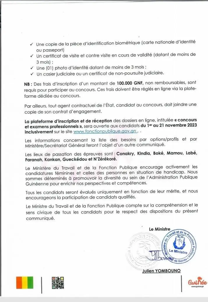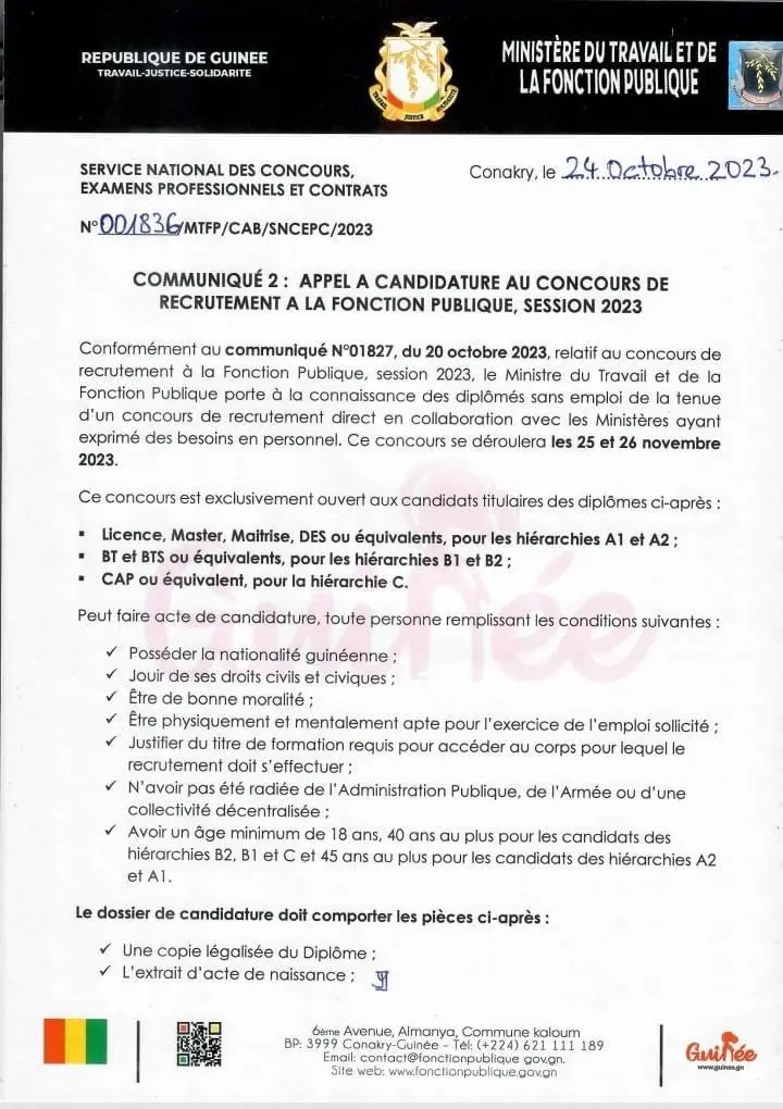 Quelques jours après avoir annoncé l’organisation prochaine d’un concours de recrutement de nouveaux fonctionnaires, le Ministère du Travail et de la Fonction Publique a publié un autre communiqué pour apporter quelques précisions sur cette affaire. Le département dirigé par Julien Yombouno précise que le concours se déroulera les 25 et 26 novembre 2023, à Conakry, Kindia, Boké, Mamou, Labé, Faranah, Kankan, Gueckédou et N’Zérékoré.