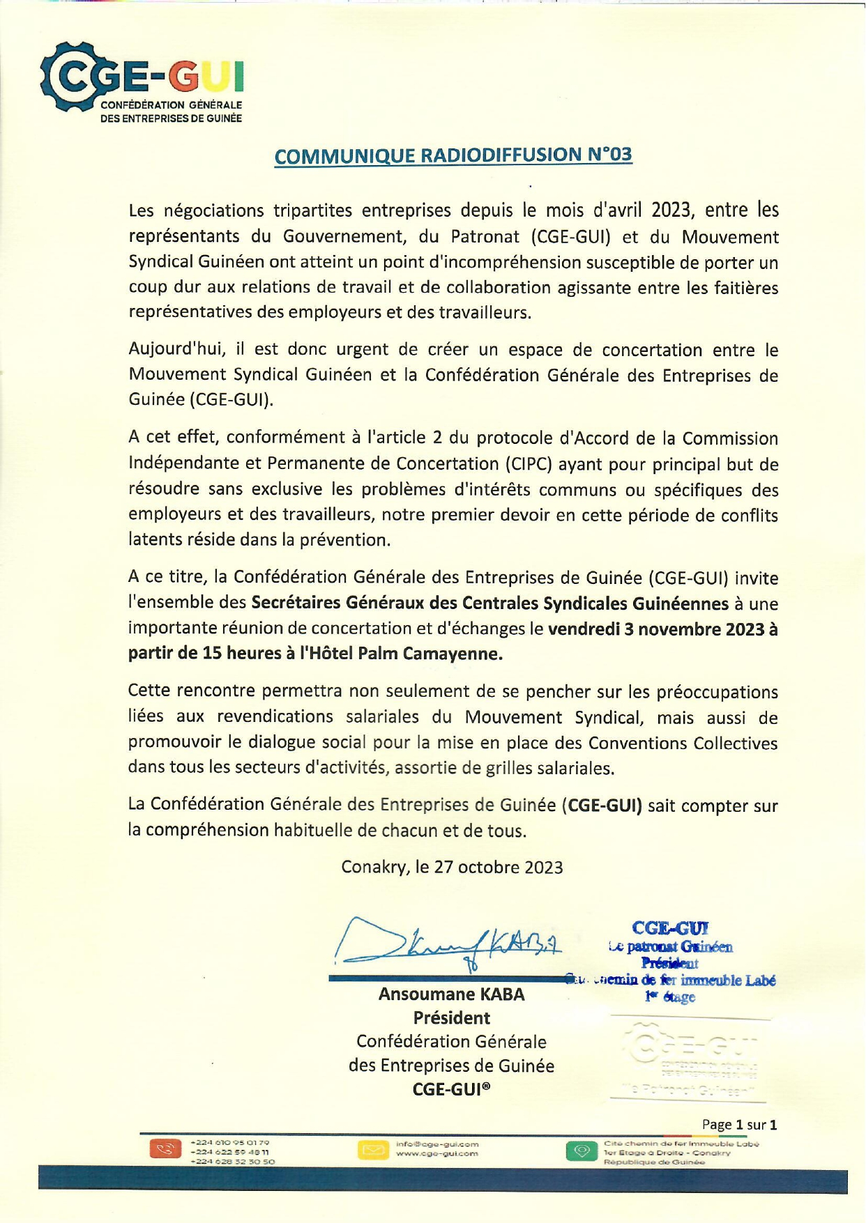 « Cette rencontre permettra non seulement sur les préoccupations liées aux revendications salariales du mouvement syndical, mais aussi de promouvoir le dialogue social pour la mise en place des conventions collectives dans tous les secteurs d’activités, assortie de grilles salariales », a annoncé le CGE-GUI dans un communiqué.