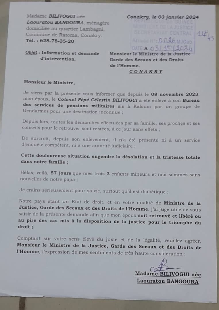 Depuis le 08 novembre 2023, la famille du colonel Célestin Bilivogui n’a pas des nouvelles de lui. Désemparée, l’épouse de cet officier de l’armée guinéenne a décidé finalement de sortir de son silence. Laouratou Bangoura, puisque c’est d’elle qu’il s’agit a adressé au ministre de la Justice et des Droits de l’Homme une lettre en date du 03 janvier dernier. Dans cet écrit, elle informe le garde des Sceaux de la disparition de son mari et a demandé à Charles Wright d’intervenir.