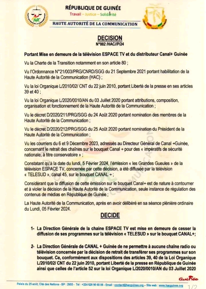 La Haute Autorité de la Communication ( HAC) n’est pas prête à permettre aux médias retirés des bouquets Canal+ et Star Time de revenir de quelle que manière que ce soit. En tout cas pour l’instant. L’institution de régulation des médias en Guinée vient de sortir ses muscles contre Espace TV qui a décidé de diffuser ses programmes sur la Télé Sud disponible sur les bouquets Canal+.