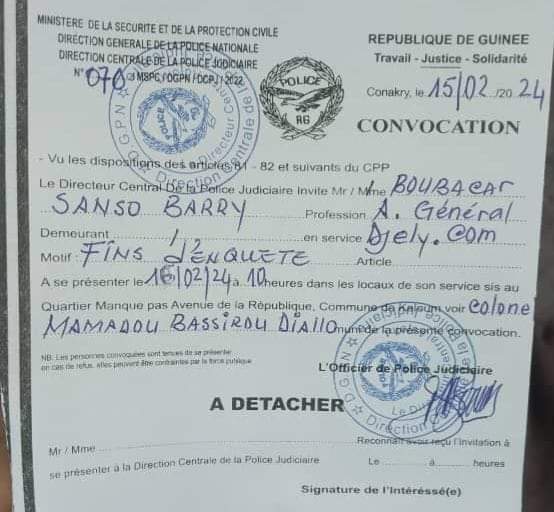 Nous venons de l’apprendre. Le journaliste et administrateur Général du site d’informations Ledjely.com est convoqué ce vendredi 16 février 2024 à la Direction centrale de la Police judiciaire. Boubacar Sanso BARRY, puisque c’est de lui qu’il s’agit doit s’y présenter à 10 heures précises. Mais, dans la convocation dont nous détenons copie, les raisons ne sont pas évoquées.
