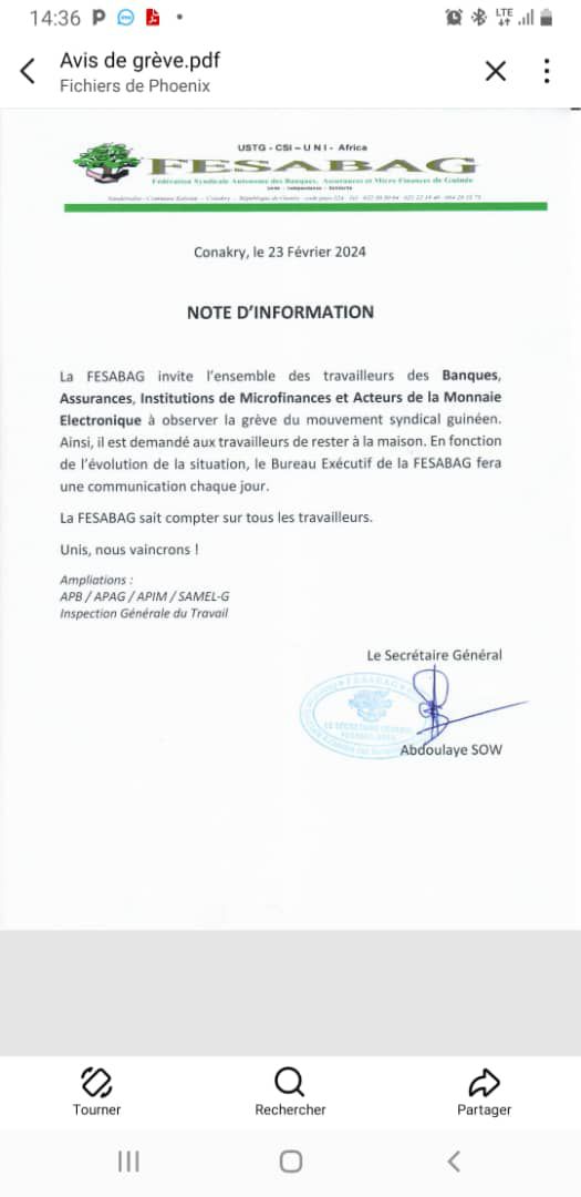 Ci-dessous, la note d’information de la FESABAG adressée aux employés des banques en Guinée.