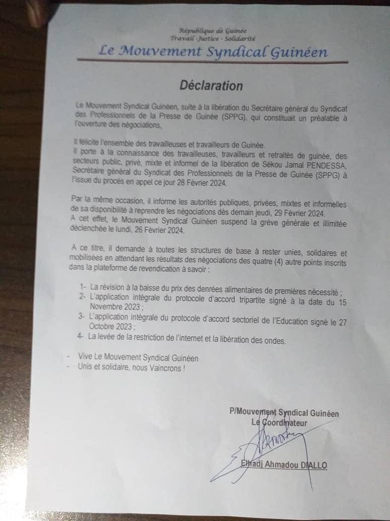 Ci-dessous, la déclaration du Mouvement Syndical Guinéen