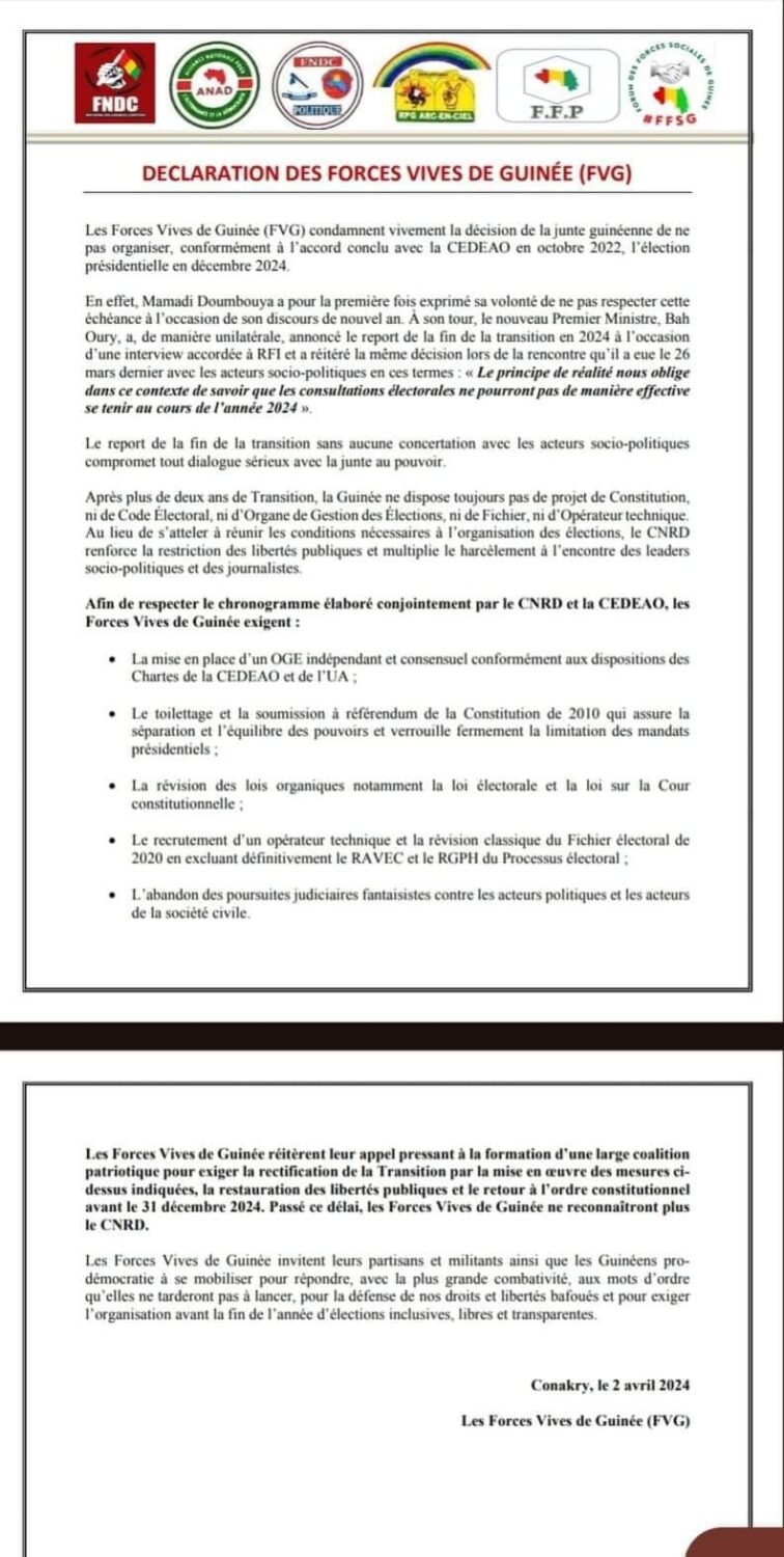 Retour à l’ordre constitutionnel: les Forces vives haussent le ton (Déclaration)