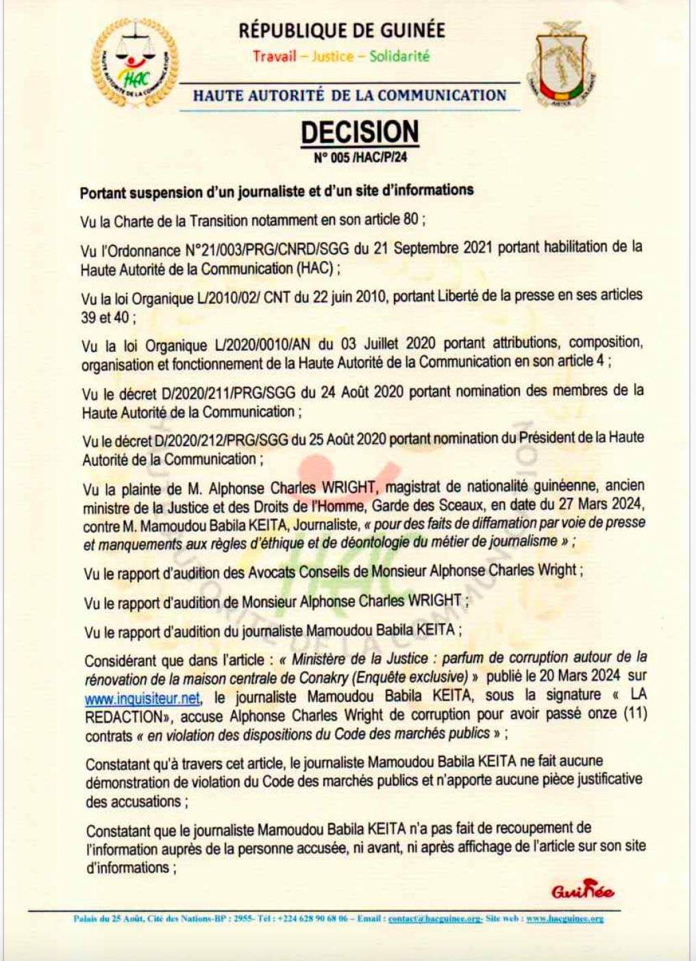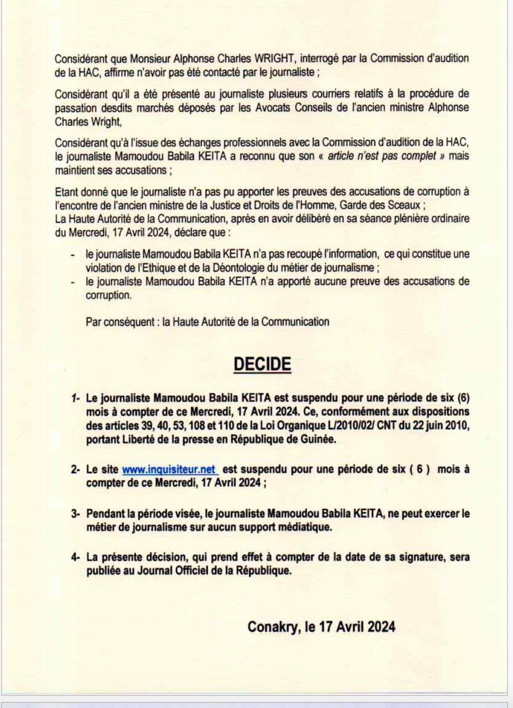 La décision est intervenue à la suite de la publication d’un article par le même journaliste concernant le projet de rénovation de la Maison Centrale de Conakry, mettant en cause l’ancien ministre Alphonse Charles.