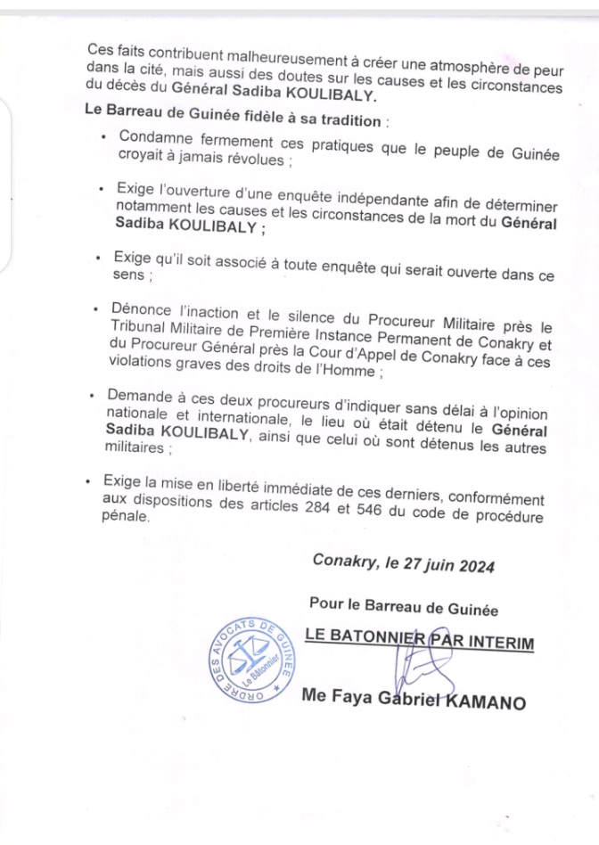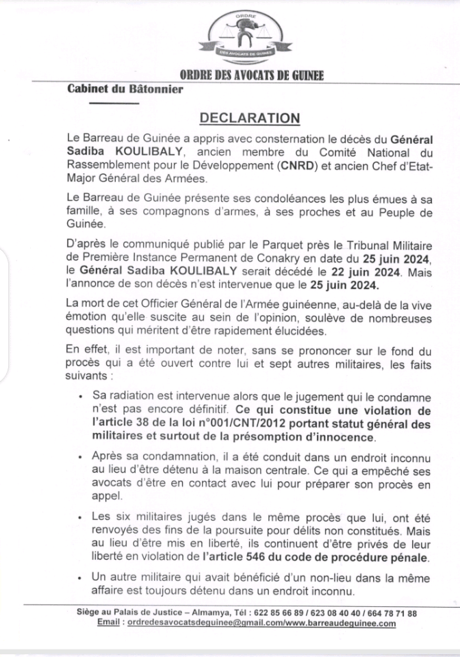 D’après le communiqué publié par le Parquet près le Tribunal Militaire de Première Instance Permanent de Conakry en date du 25 juin 2024, le Général Sadiba KOULIBALY serait décédé le 22 juin 2024. Mais l’annonce de son décès n’est intervenue que le 25 juin 2024.