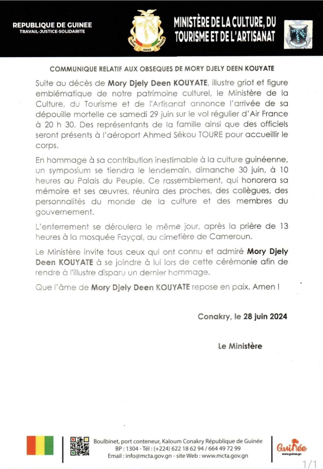 Culture: le corps de Mory Djely arrive samedi, le ministère annonce un symposium pour honorer sa mémoire (Communiqué)