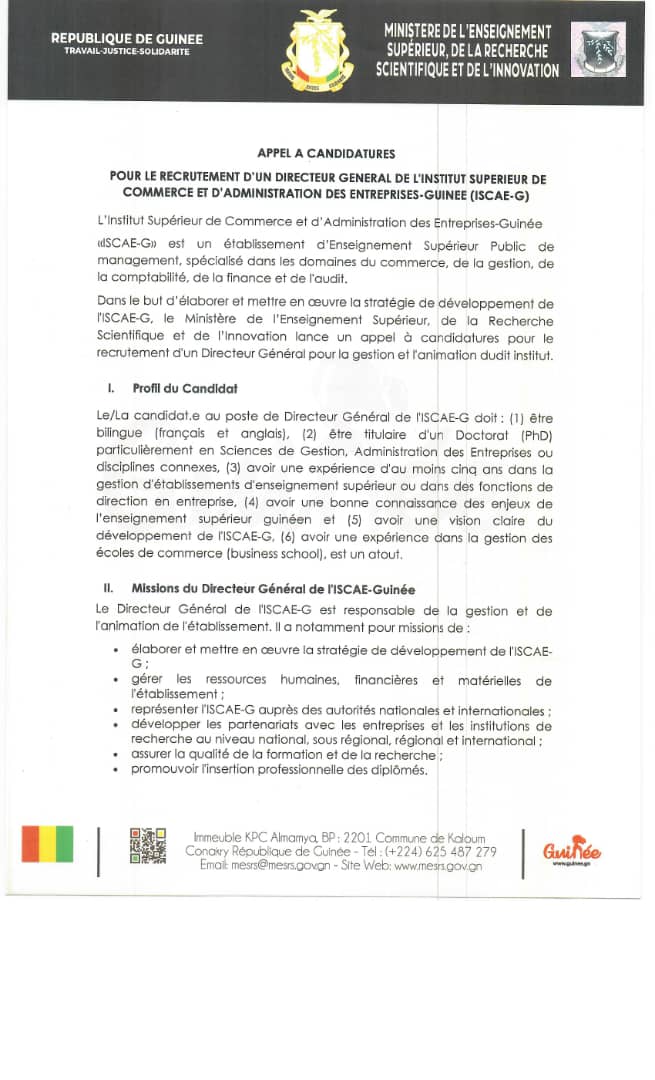 Appel à candidatures pour le recrutement d’un Directeur Général de l’Institut supérieur de commerce et d’administration des entreprises-Guinée (ISCAE-G)