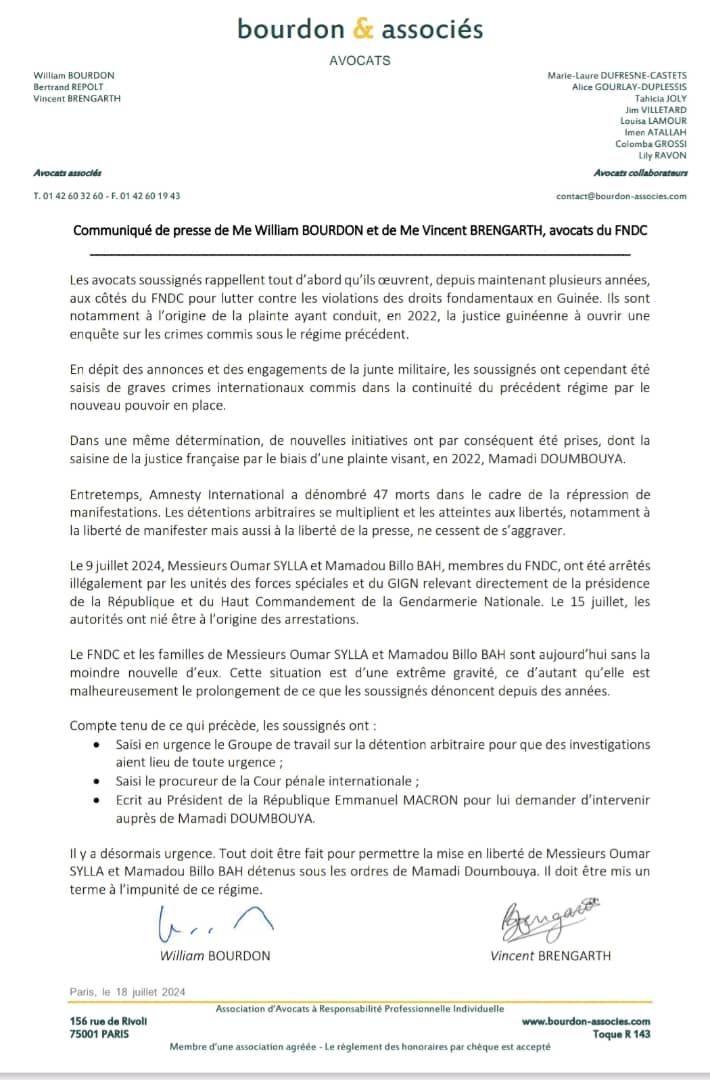Arrestation de Foniké Menguè et Billo Bah : la Cour Pénale Internationale et Emmanuel Macron sollicités pour intervenir