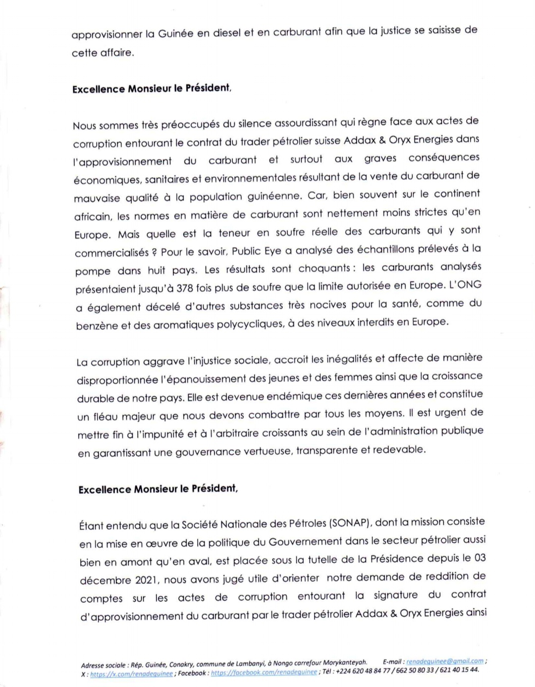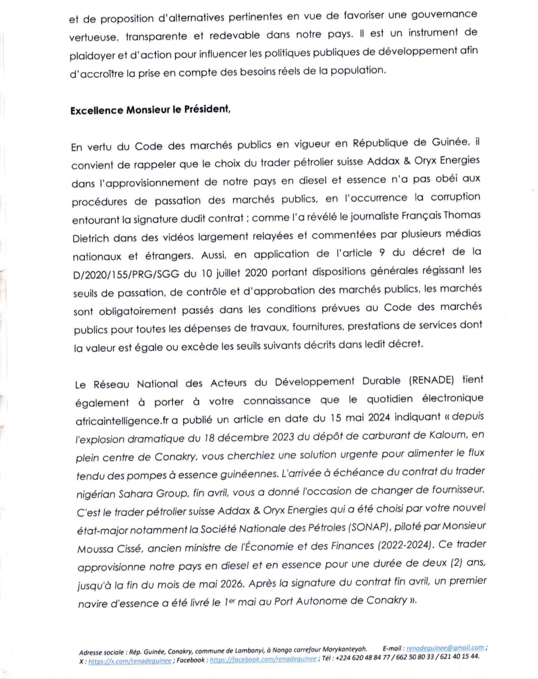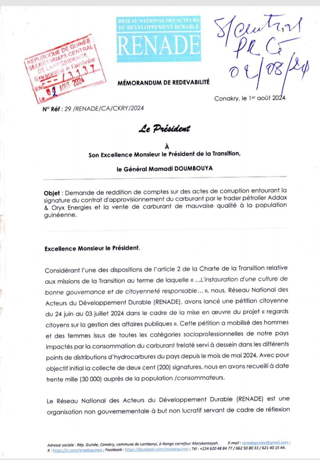 Dans le cadre de la lutte contre la corruption liée au contrat du trader pétrolier suisse Addax & Oryx Energies, le Réseau National des Acteurs du Développement Durable (RENADE) a adressé un mémorandum de redevabilité au Président de la Transition, le Général Mamadi Doumbouya. Ce mémorandum demande des comptes sur les actes de corruption entourant la signature du contrat d’approvisionnement en carburant par Addax & Oryx Energies, ainsi que sur la vente de carburant de mauvaise qualité à la population guinéenne.