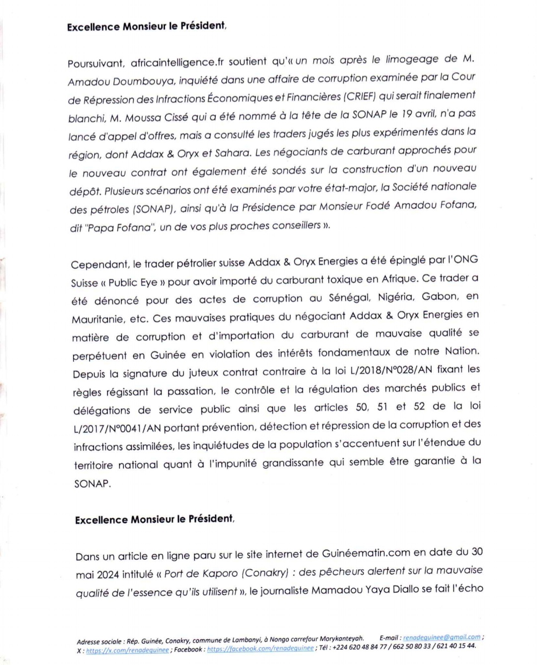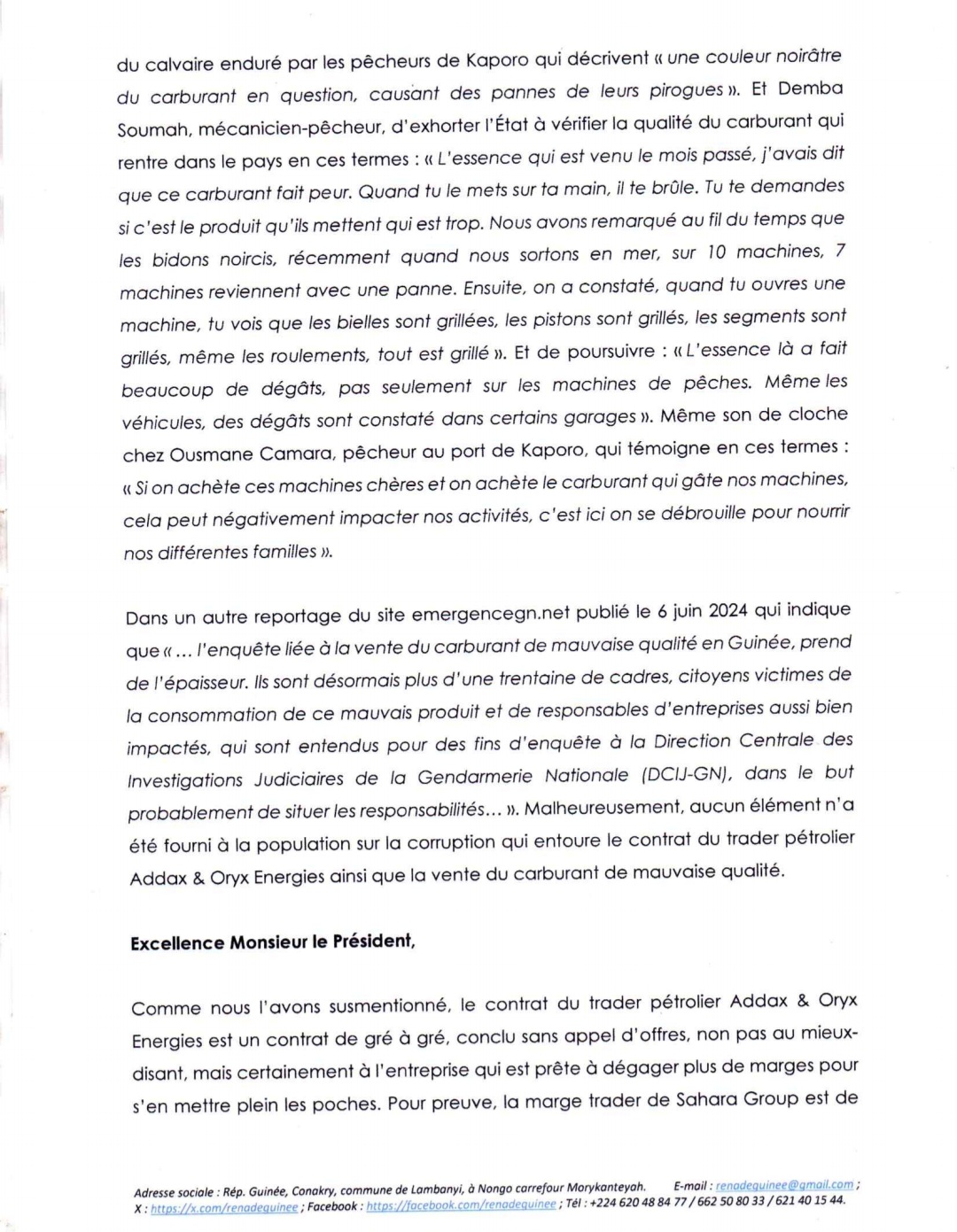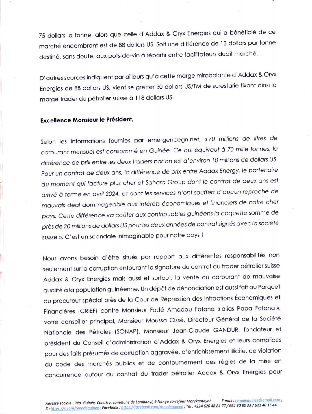 Dans le cadre de la lutte contre la corruption liée au contrat du trader pétrolier suisse Addax & Oryx Energies, le Réseau National des Acteurs du Développement Durable (RENADE) a adressé un mémorandum de redevabilité au Président de la Transition, le Général Mamadi Doumbouya. Ce mémorandum demande des comptes sur les actes de corruption entourant la signature du contrat d’approvisionnement en carburant par Addax & Oryx Energies, ainsi que sur la vente de carburant de mauvaise qualité à la population guinéenne.