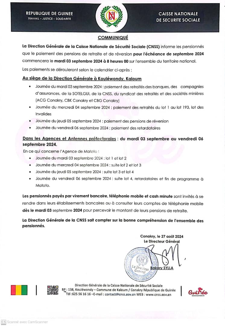 Pensions: le paiement de l’échéance de septembre commence 03 septembre (Communiqué)