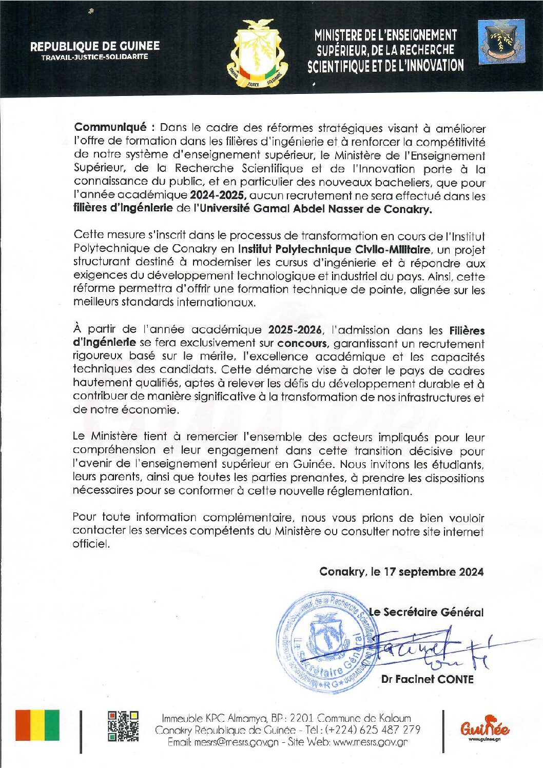 Enseignement supérieur: pas d’orientation dans les filières d’ingénierie de Gamal cette année (Communiqué)