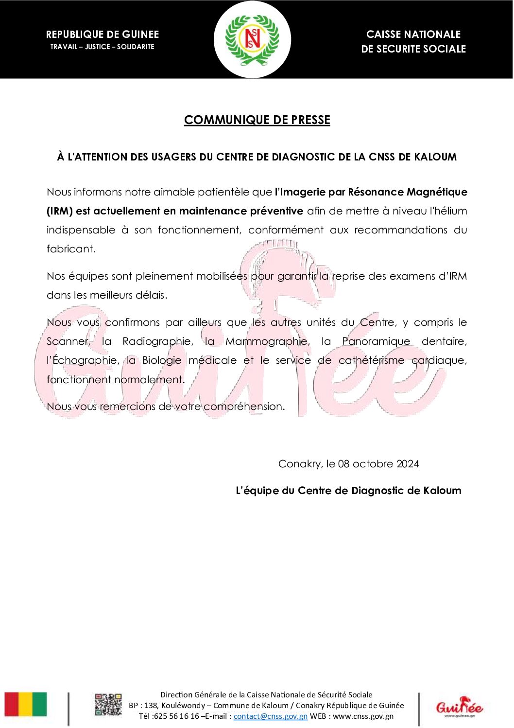 Centre de diagnostique de la CNSS (Conakry): l’IRM en maintenance préventive (Communiqué)