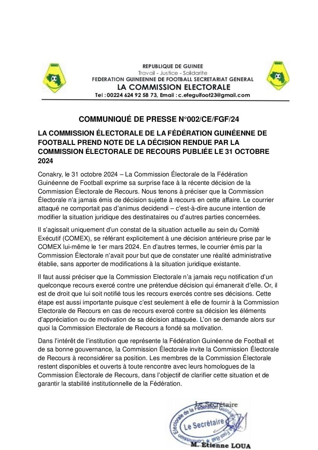 La Commission électorale de la Fédération guinéenne de football remet en question le verdict de la Commission de recours, qui a annulé la cooptation de plusieurs membres désignés par le président Bouba Sampil. Dans un communiqué, elle appelle cette dernière à réévaluer sa décision, amplifiant ainsi les discordes internes.