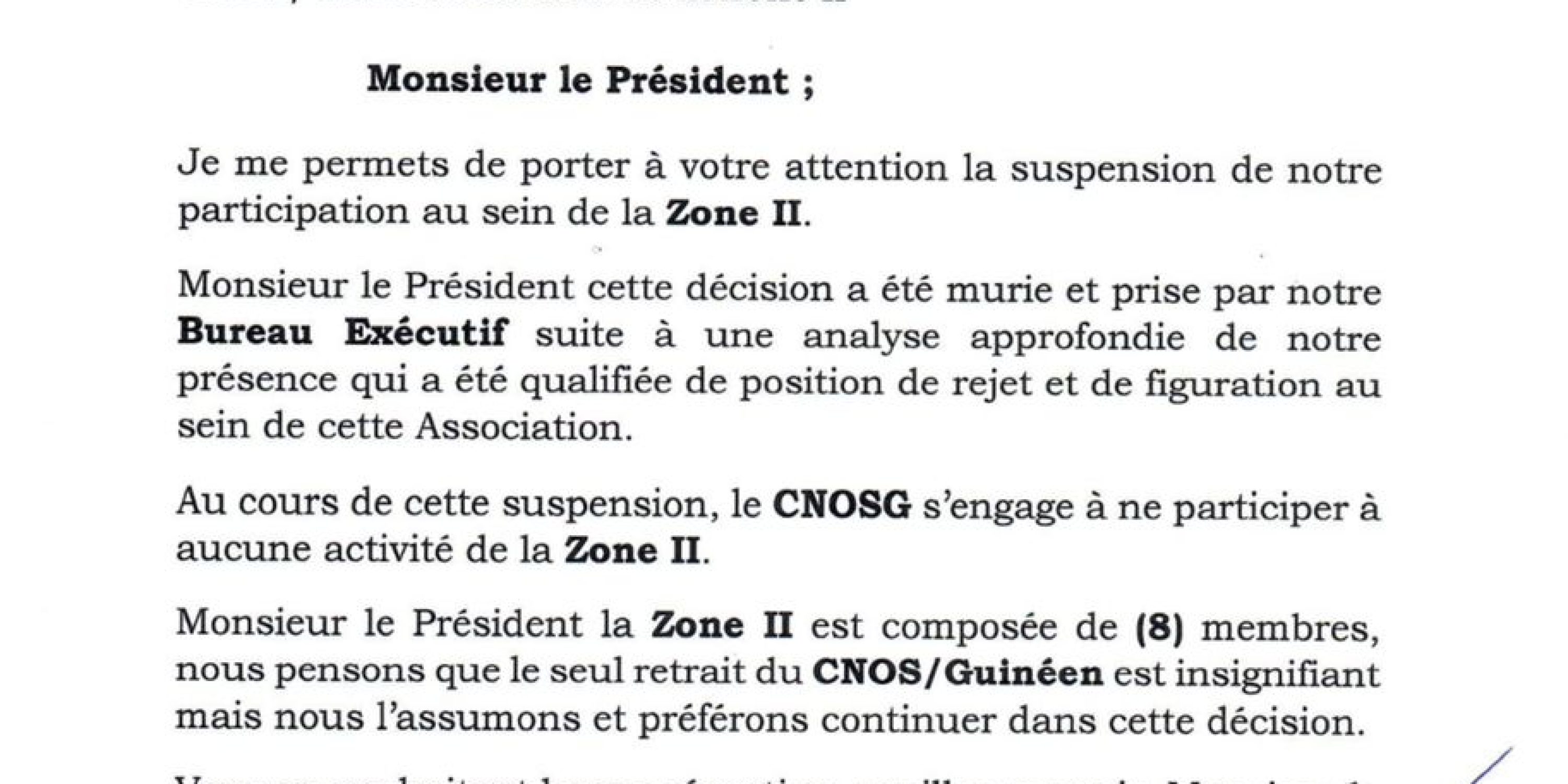 Le Comité National Olympique et Sportif Guinéen informe le mouvement sportif africain et mondial, de son retrait de la zone 2 de l’Association des Comités Nationaux Olympiques d’Afrique. Ci-dessous la lettre :