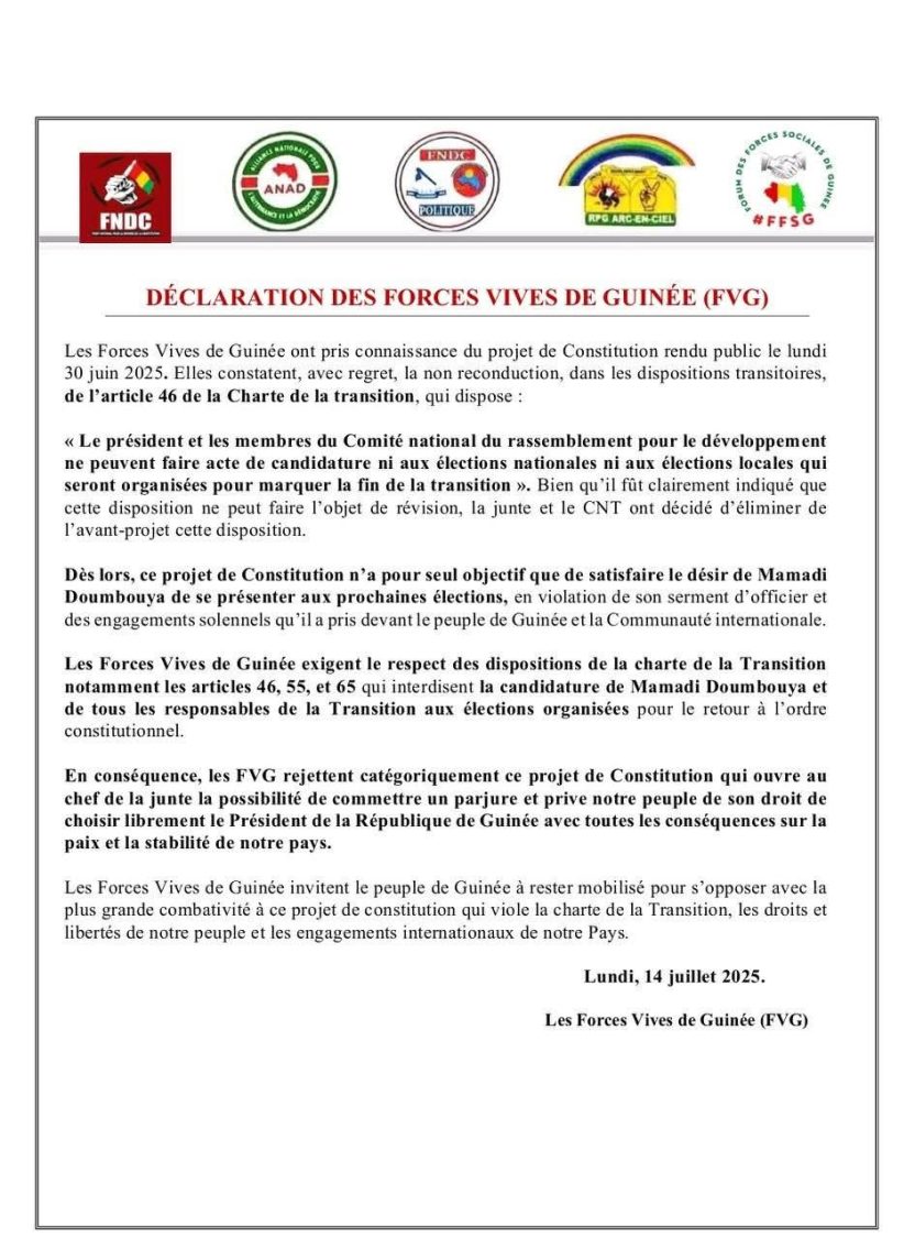 A travers la déclaration ci-dessous, parvenue à la rédaction de Guinee114.com, le RPG de l’ancien président Alpha Condé, l’UFDG de Cellou Dalein Diallo, l’UFR de Sidya Touré et d’autres organisations qui forment avec eux ce qu’ils appellent « Les Forces Vives », disent rejetter le projet de nouvelle constitution. Lisez leur déclaration !